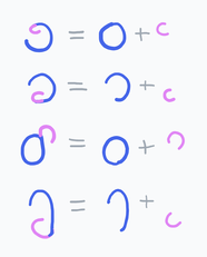 It's imagined that the letters , , , and were originally formed by joining the vowel letters of each diphthong into more complex shapes that could still be written in a single stroke. (u) came to be used for the 'o' in 'ao' and 'oı' because of its simpler shape. (ao) was assigned a wider glyph than the other diphthongs because Toaq phonology allows it to be pronounced as two syllables when stressed ([aː.o]).